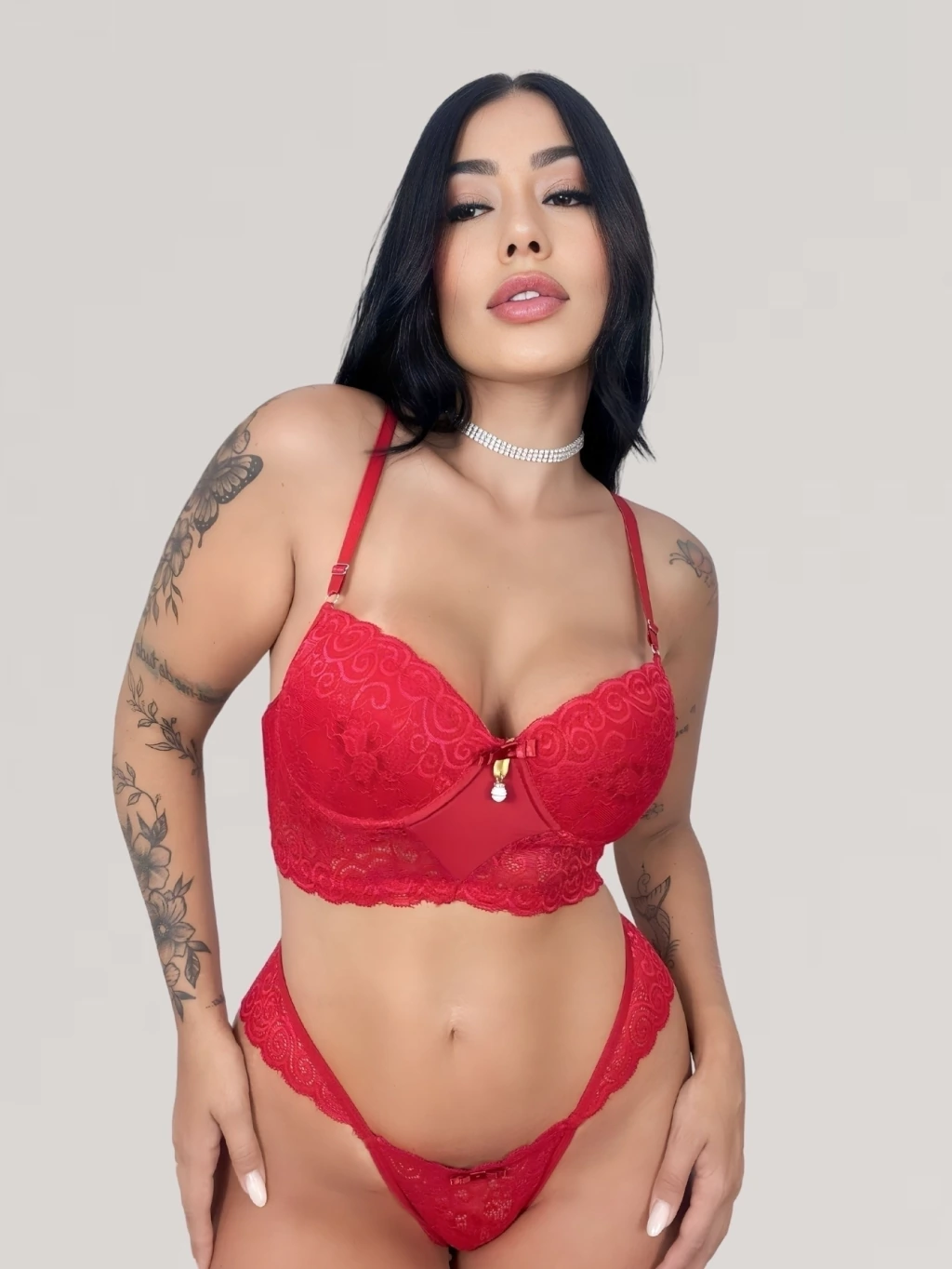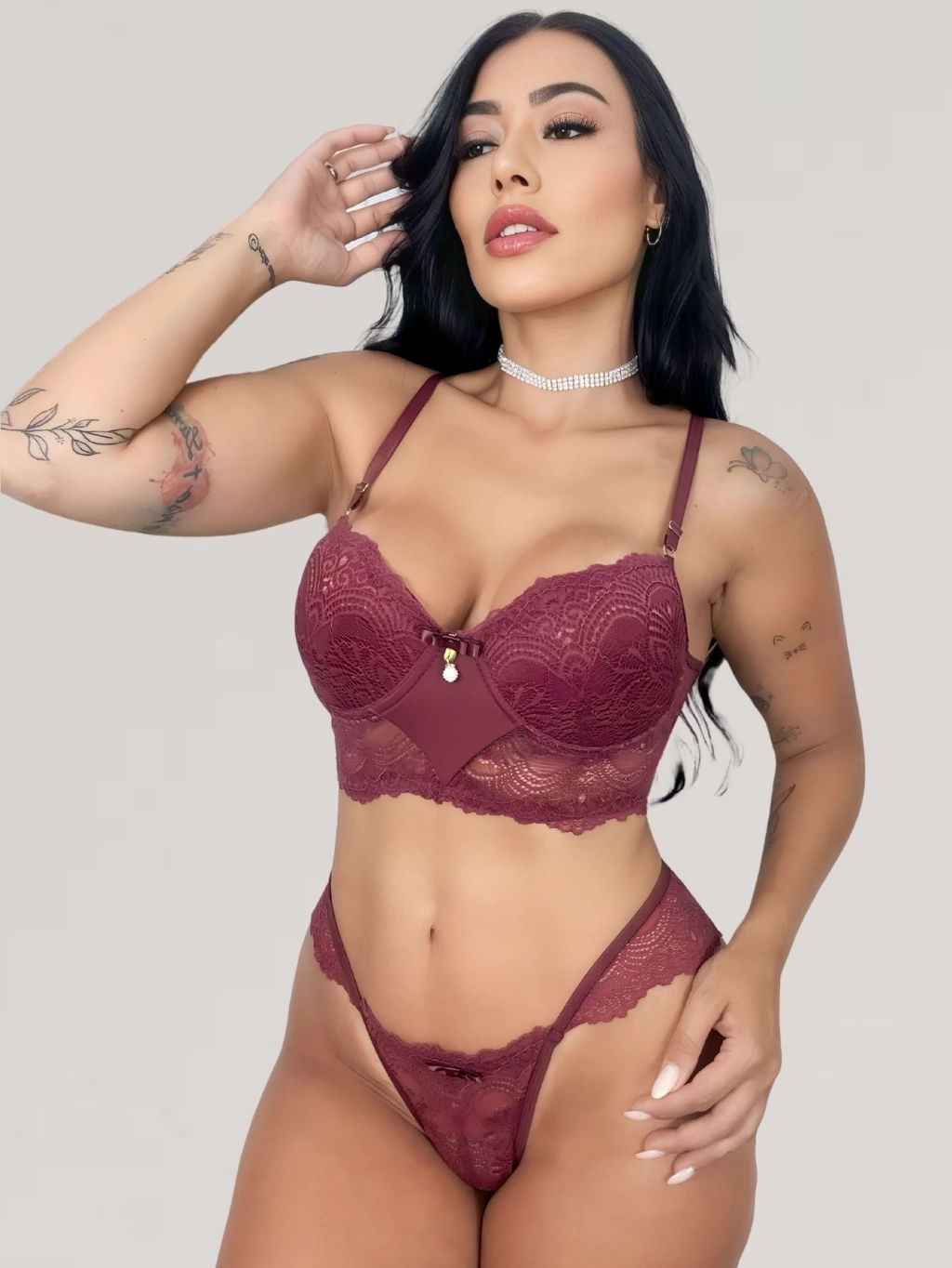 O design elegante e sofisticado do conjunto é realçado com calcinha em renda, que é trabalhada de forma detalhada.