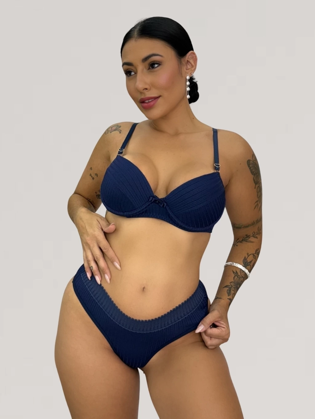 O design elegante e sofisticado do conjunto é realçado com calcinha em poliamida, que é trabalhada de forma detalhada.