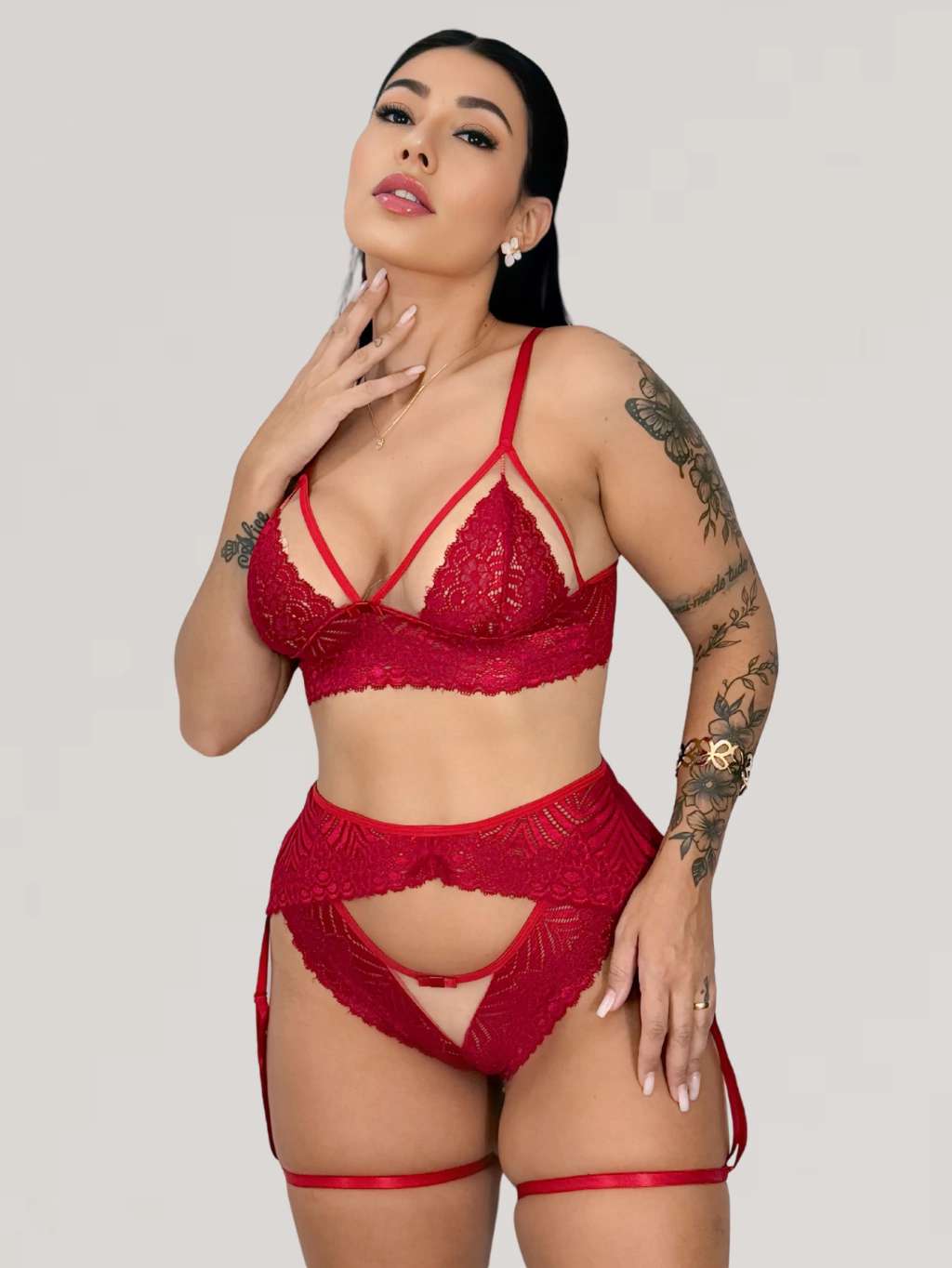 Esse conjunto luxuoso é confeccionado em renda poliamida, garantindo conforto, durabilidade e resistência, além de possuir um toque macio.