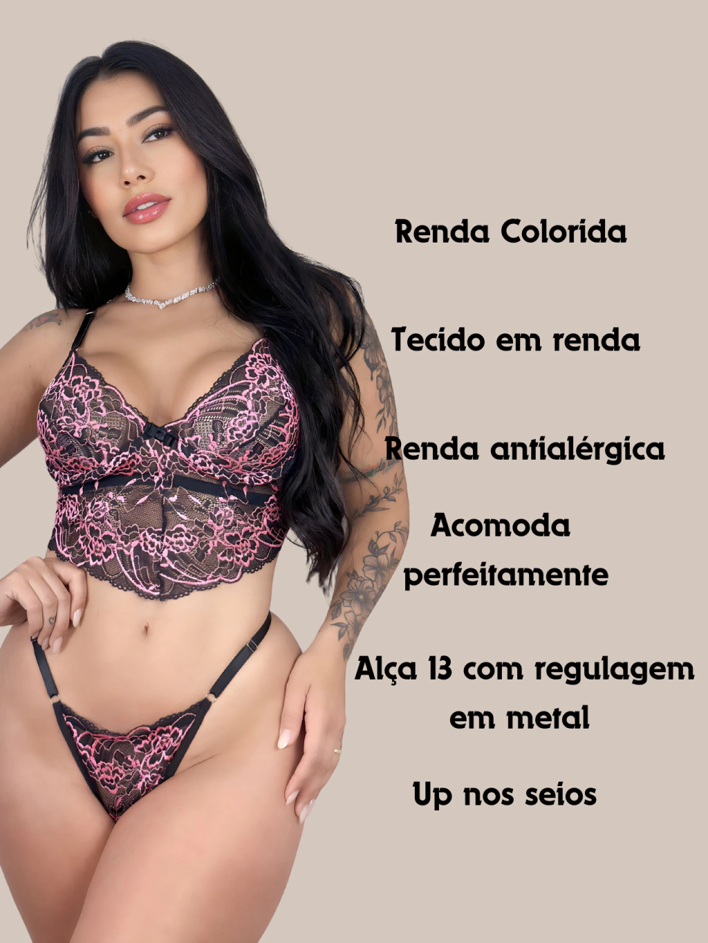 O design elegante e sofisticado do conjunto é realçado pela renda bicolor, que é trabalhada de forma detalhada.