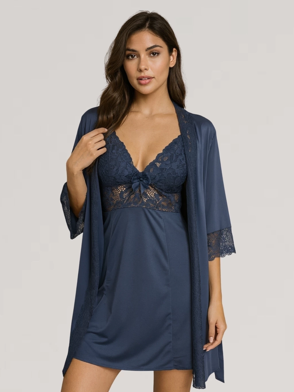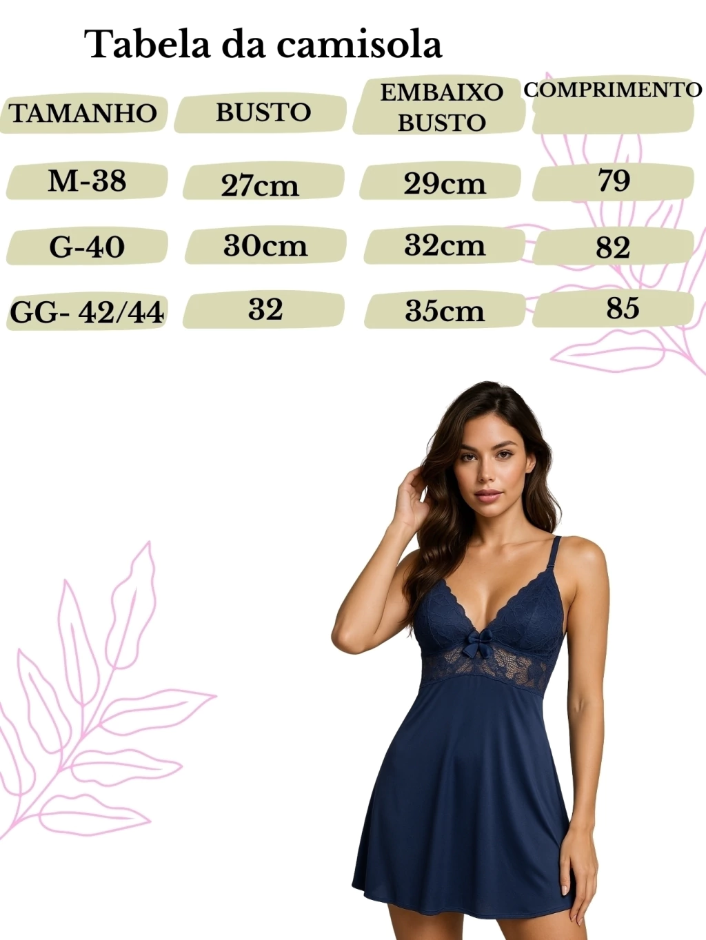Acompanha um robe no mesmo tecido, com acabamento em renda e uma charmosa fita de cetim para amarração, completando o visual com elegância e sofisticação.