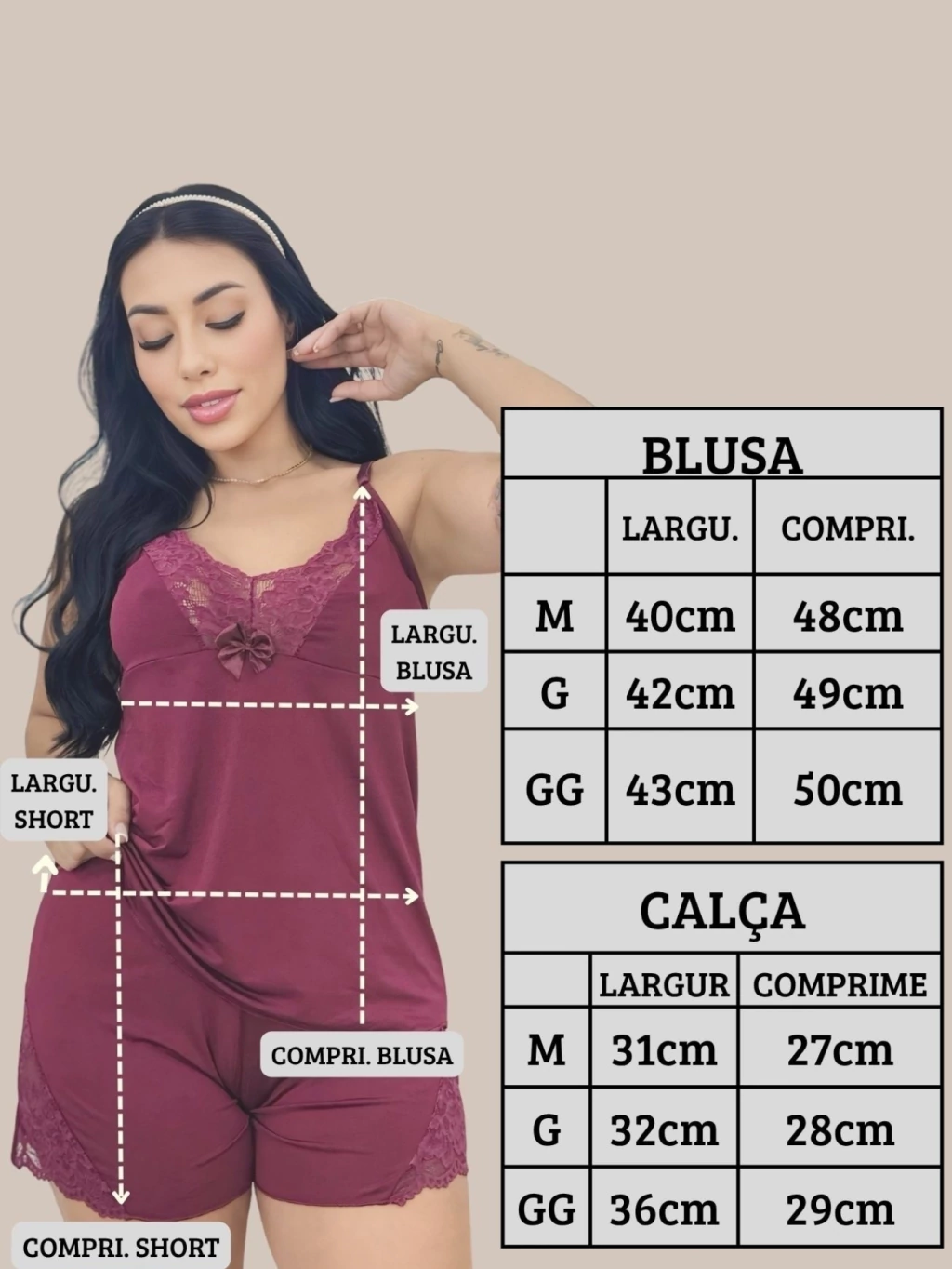 • Detalhes em renda no bojo, costas da blusa e laterais do short